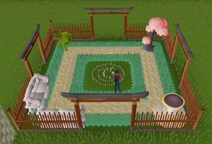 A player with a zen themed superior garden, surrounded by a redwood fence.